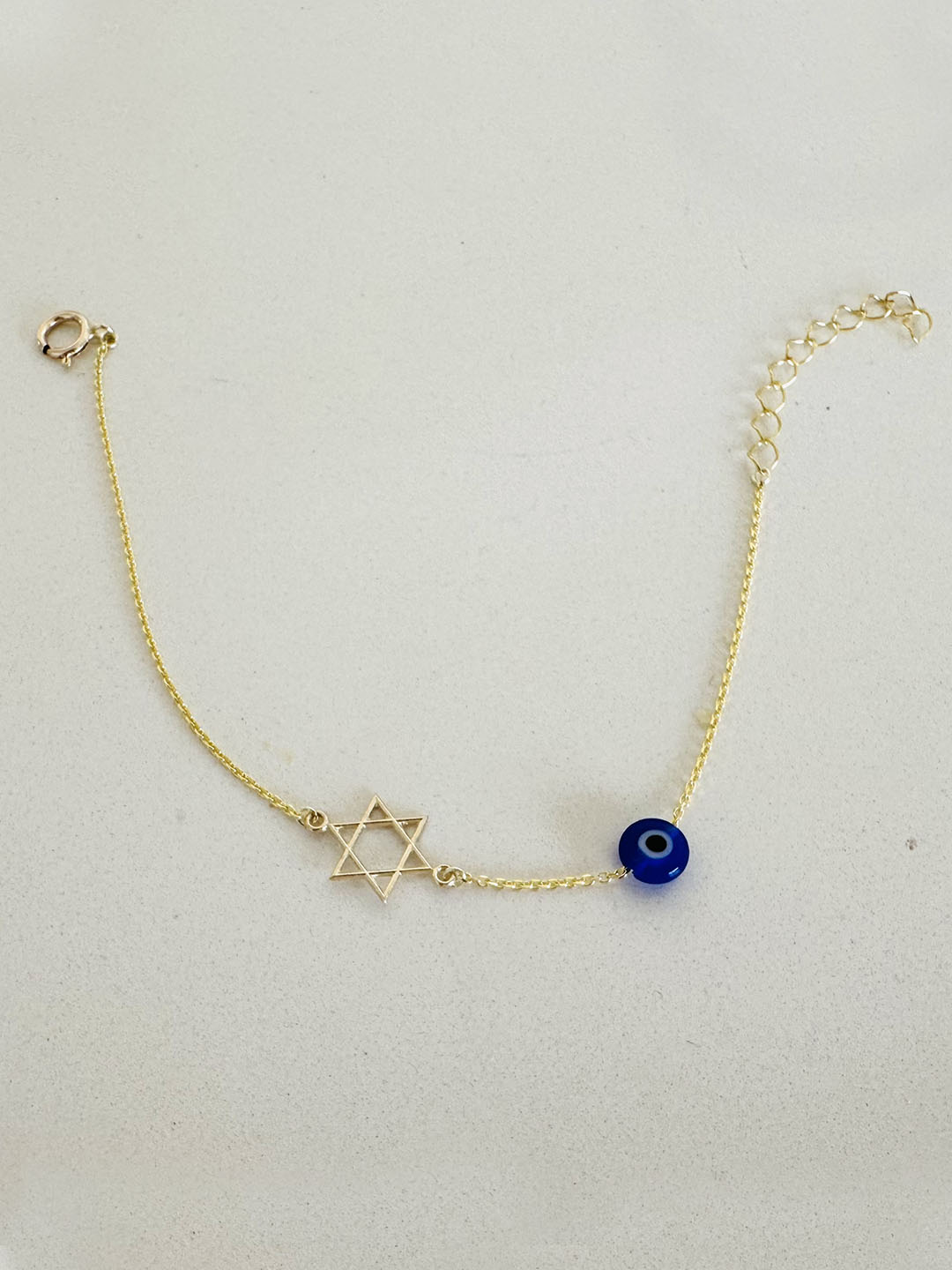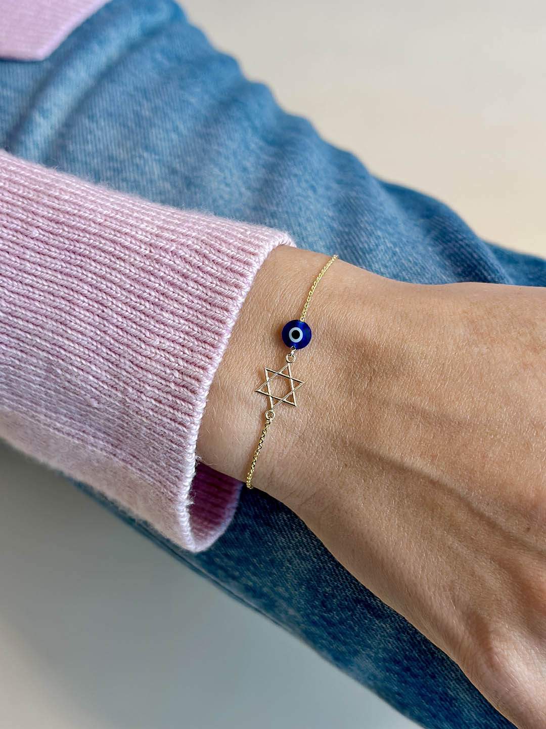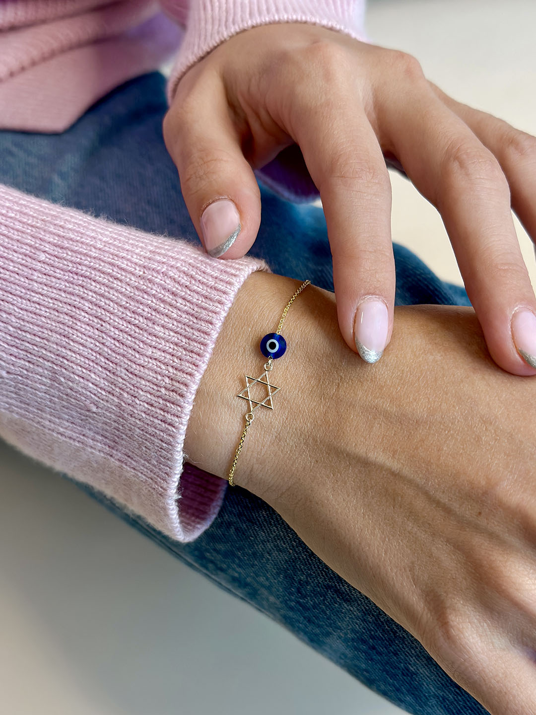 Gold Star of David and Blue Evil Eye Bracelet, 14K Solid Yellow Gold