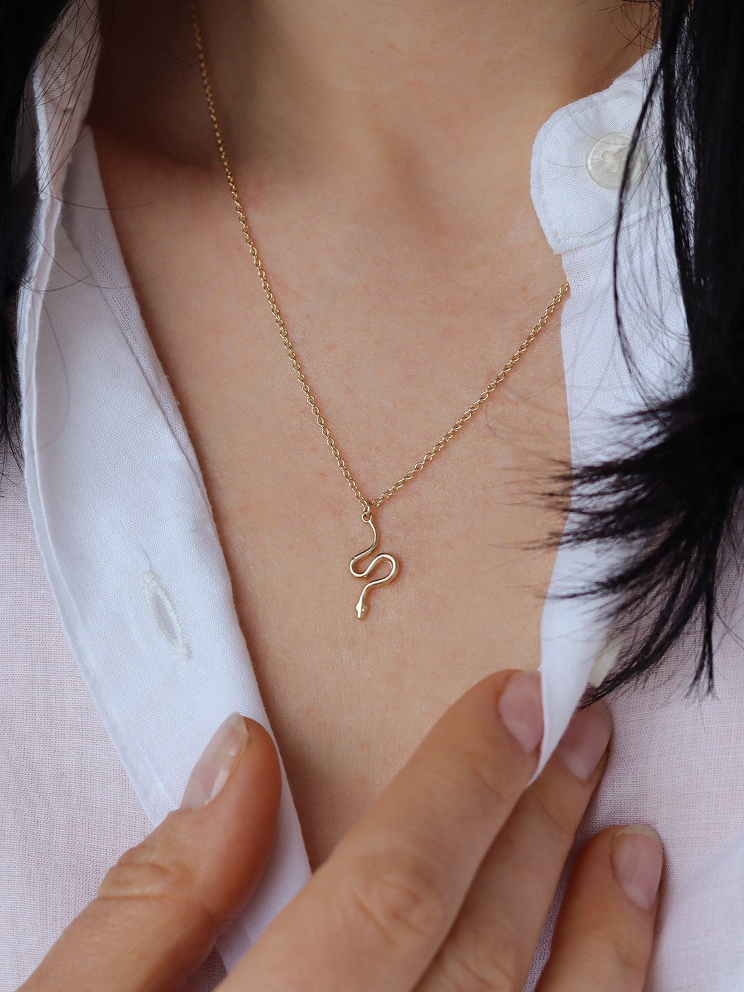 Add a touch of mystery and power to your look with this 14K solid gold snake necklace. Delicate yet bold, the polished serpent pendant shimmers with minimalist elegance. The snake symbolizes wisdom, transformation, feminine energy, and new opportunities—making this piece a meaningful addition to your jewelry collection, especially as we embrace the Year of the Snake.