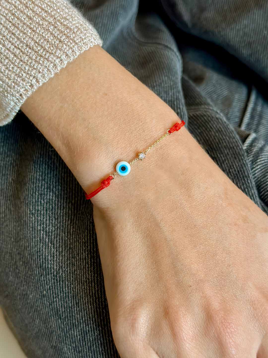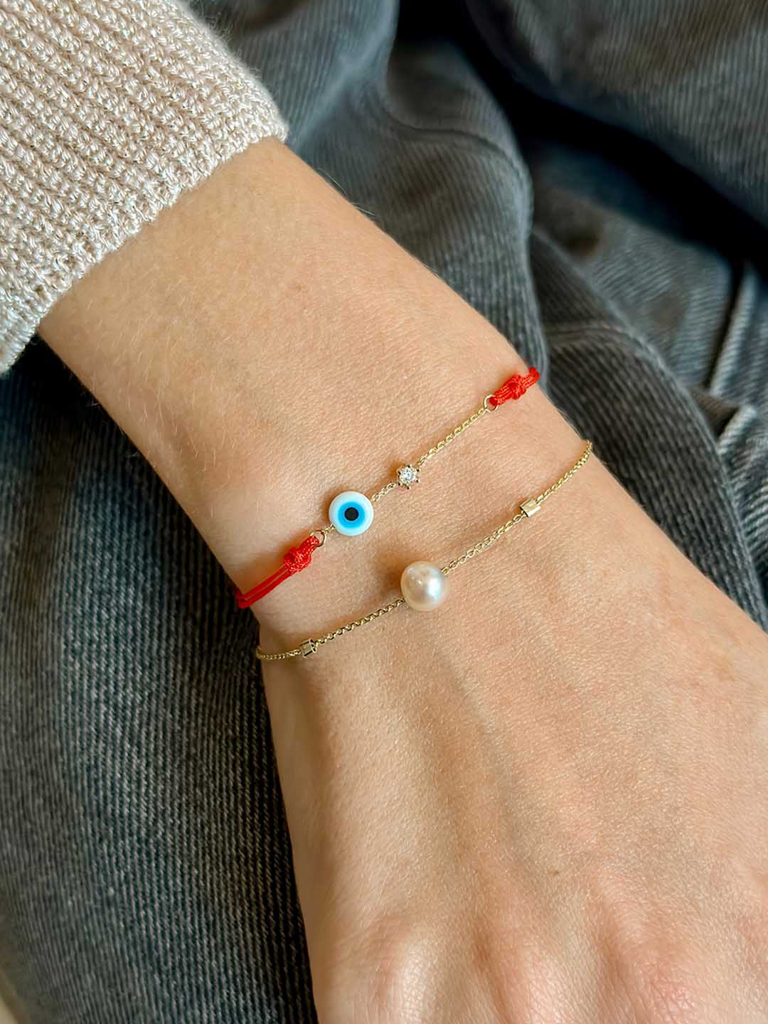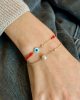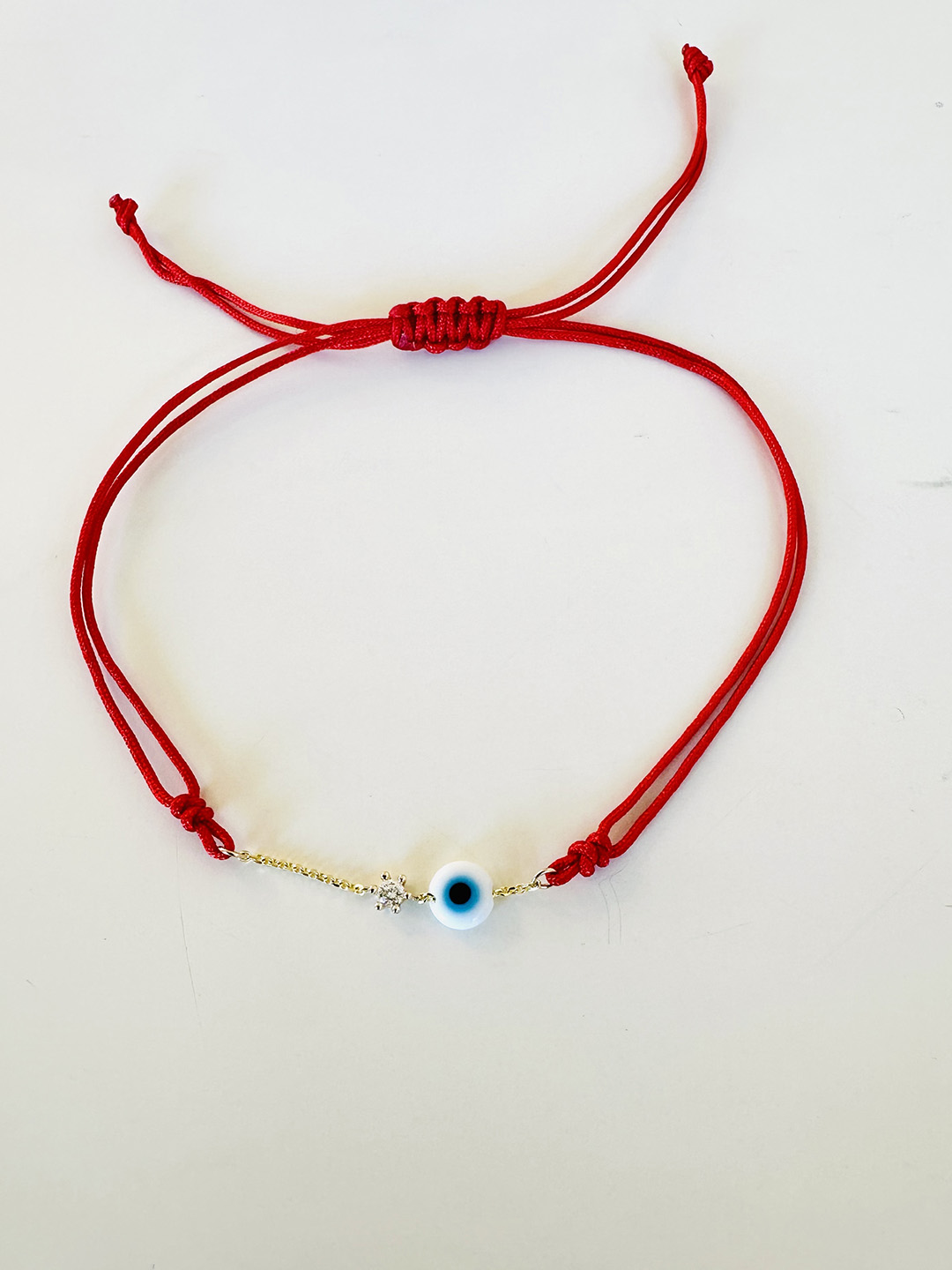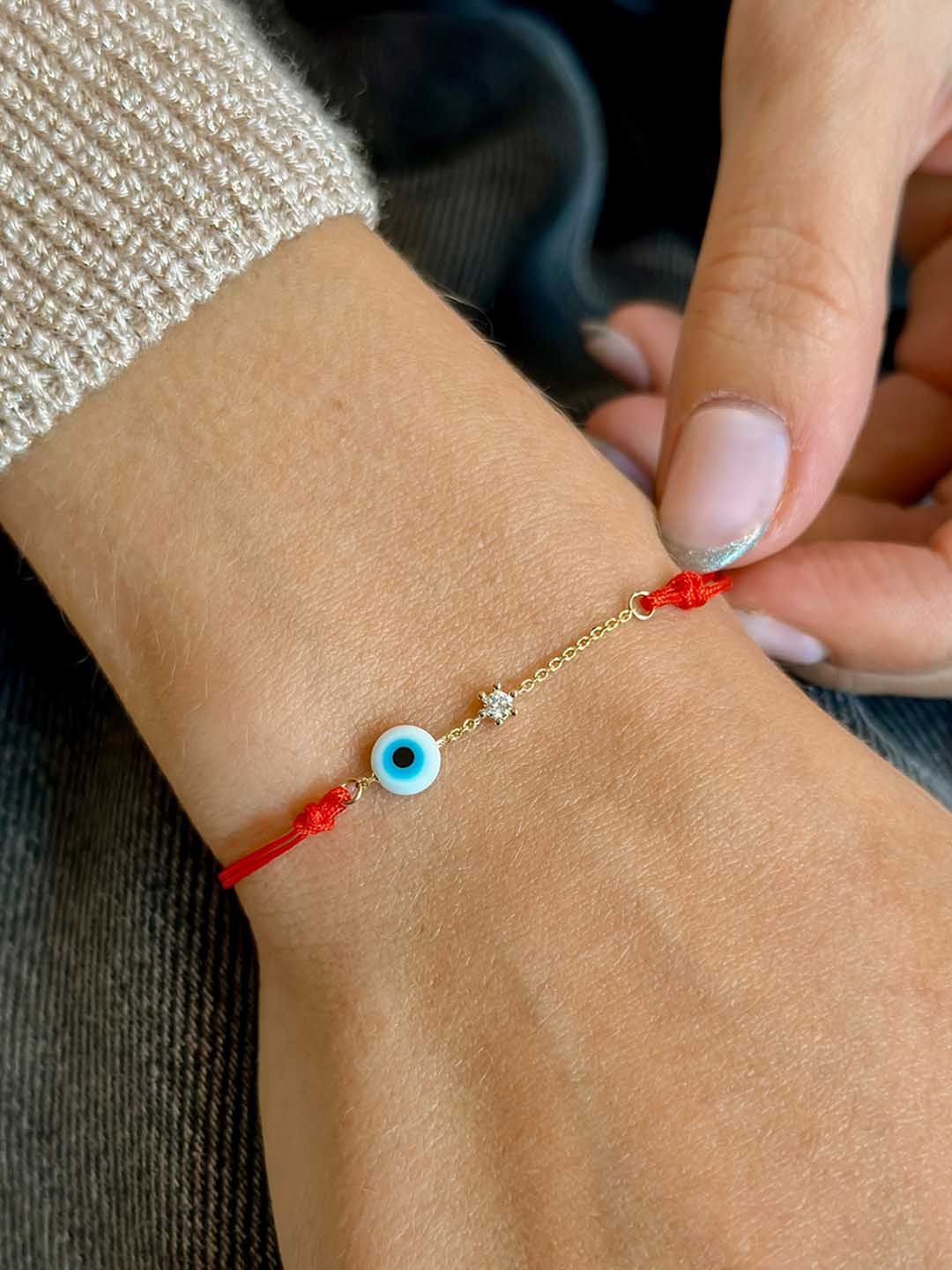 white evil eye and diamond red rope bracelet, 14K solid yellow gold